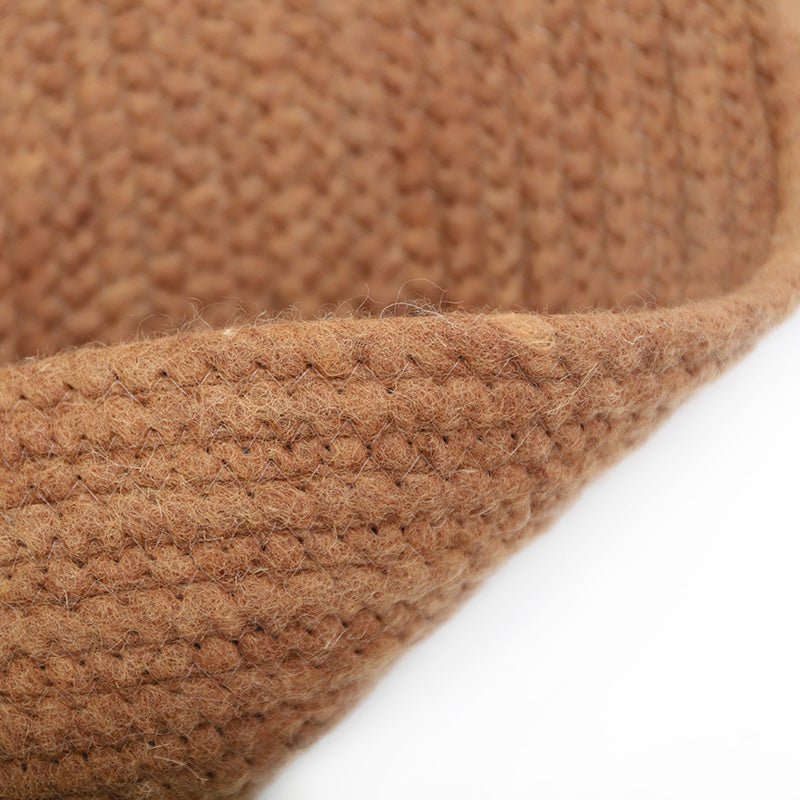Osnova preproge je zasnovana na unikatni tehniki: debela bombažna vrv služi kot trdno jedro, ki je nato skrbno ovito z mehko in trpežno polsteno volno. Ta premišljena kombinacija materialov zagotavlja, da preproga ohrani svojo strukturo, je izjemno stabilna in odporna na vsakodnevno uporabo, hkrati pa ohranja svojo naravno mehkobo.